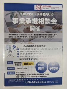 無料相談会を11月13日(木)に実施いたします。 2025.10.16 11月13日13時から19時のスケジュールで、大阪市福島区のJCF事務所にて無料相談会を実施いたします。事業承継にご興味のある経営者の方は、ホームページからお問い合わせください。